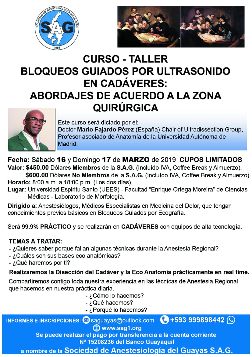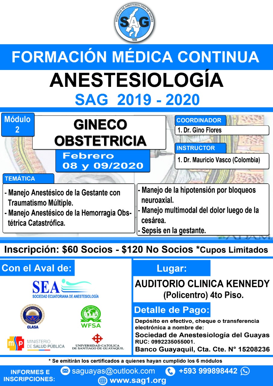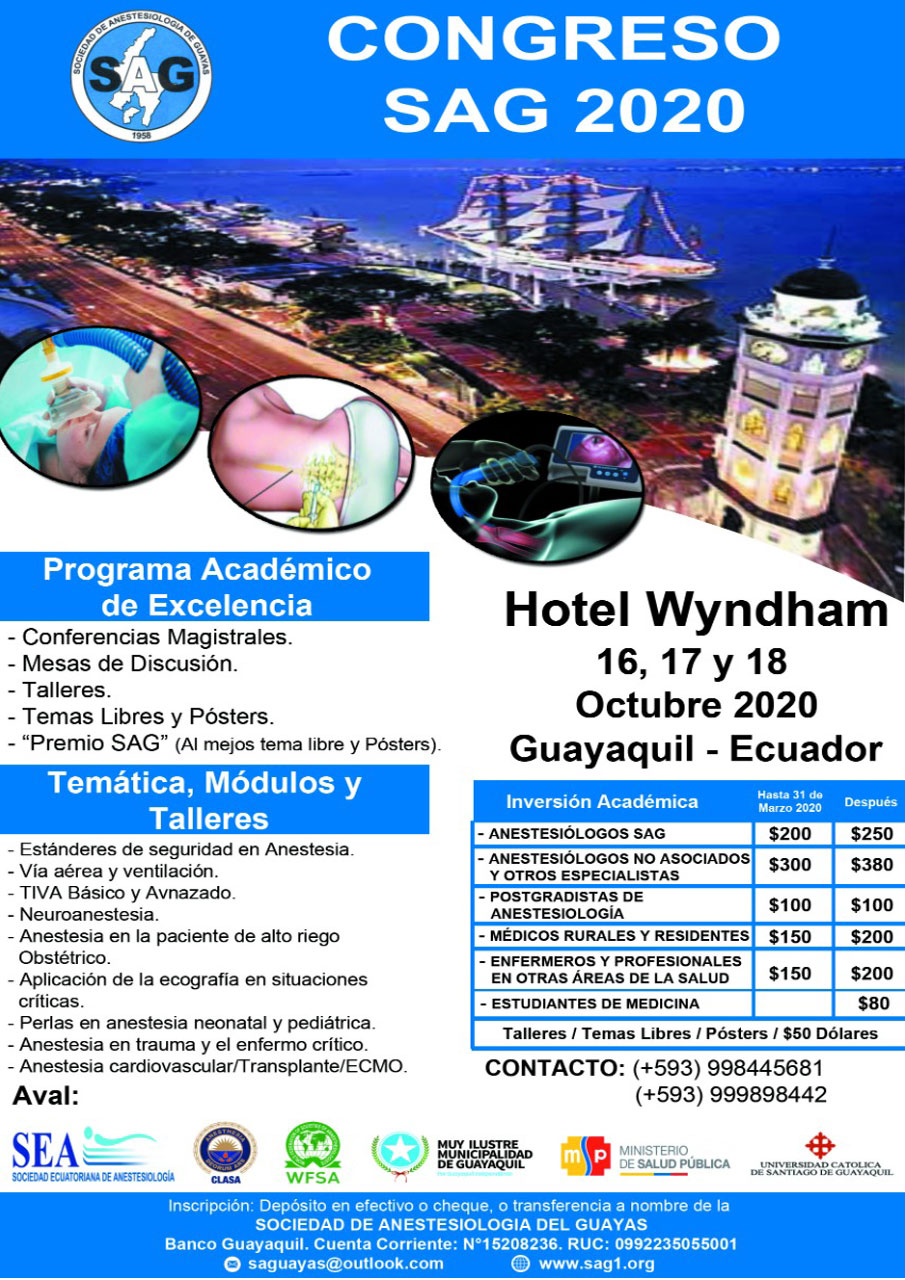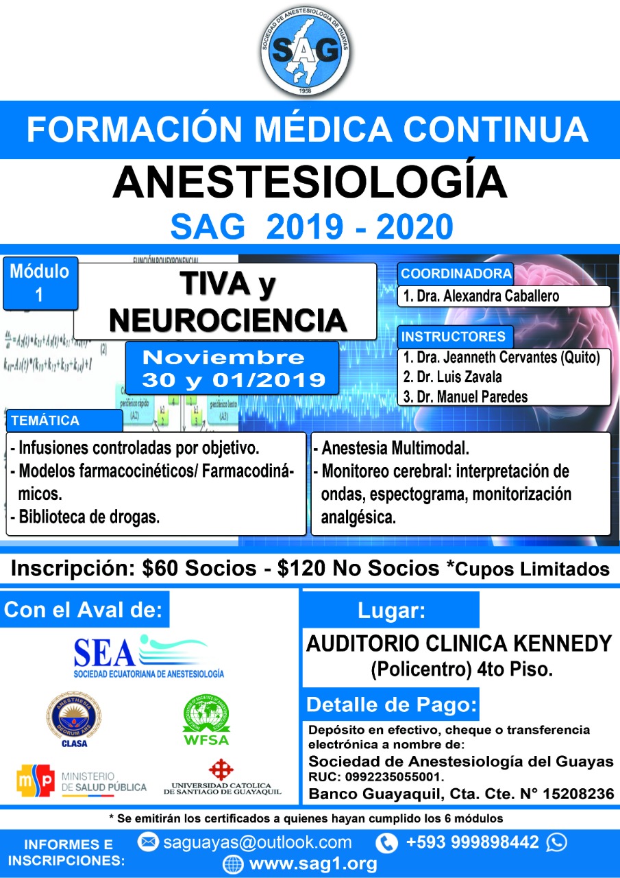 La Sociedad de Anestesiología del Guayas es una persona jurídica de derecho privado, de carácter científica, gremial y cultural sin propósitos de lucro, constituida el 6 de Julio de 1958 y registrada legalmente ante las leyes del Ecuador el 19 de Septiembre de 1995, con domicilio en la ciudad de Guayaquil y cuyo nombre y siglas son: Sociedad de Anestesiología del Guayas, S.A.G